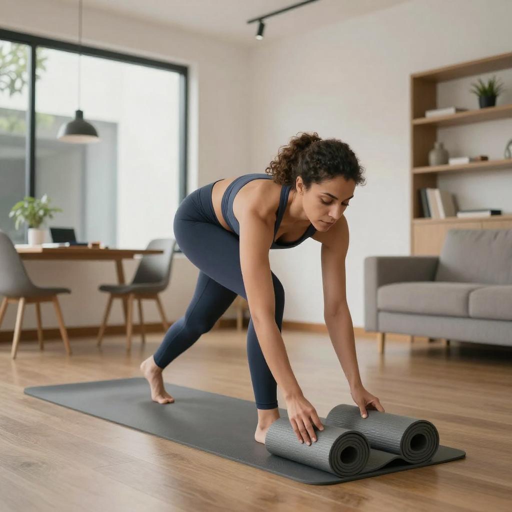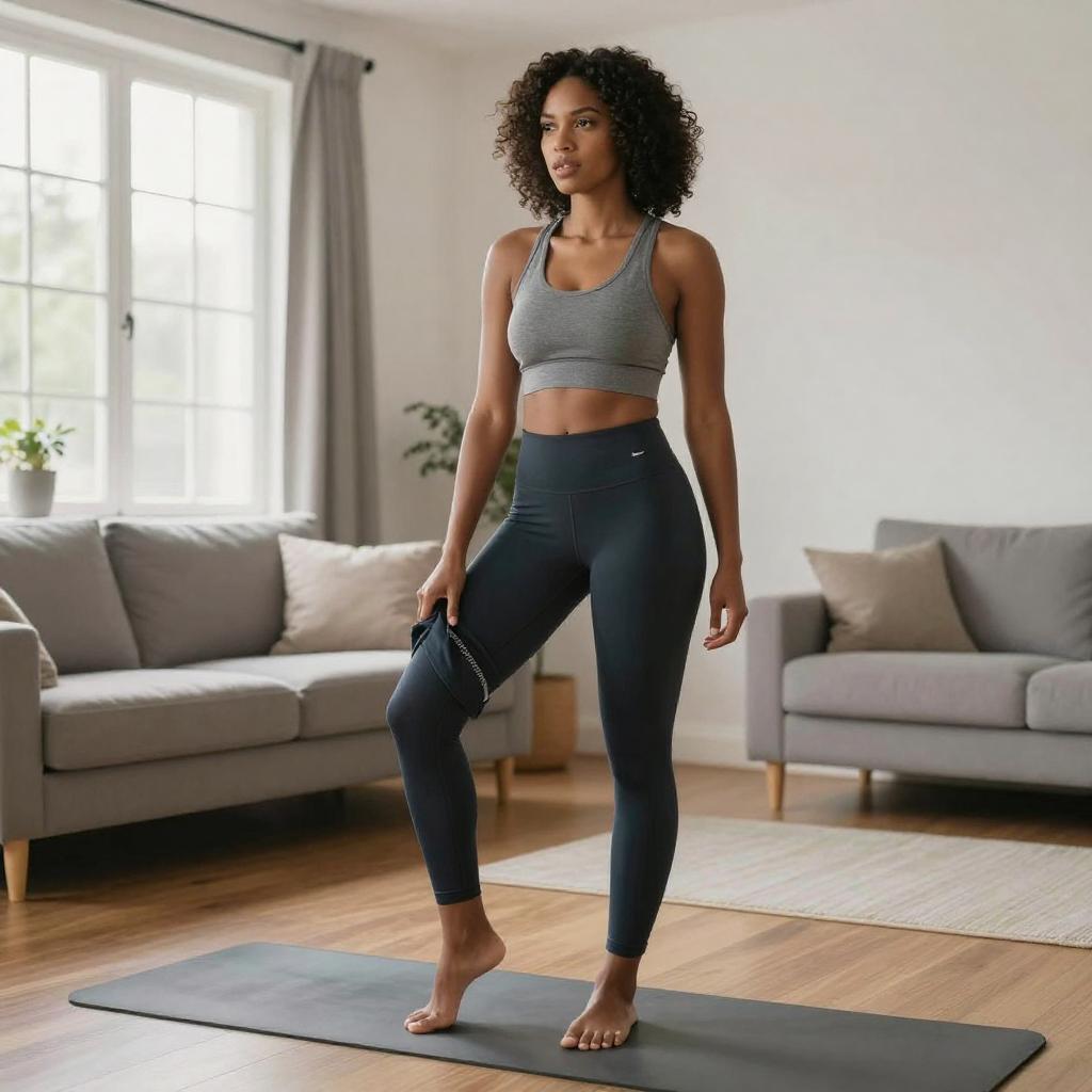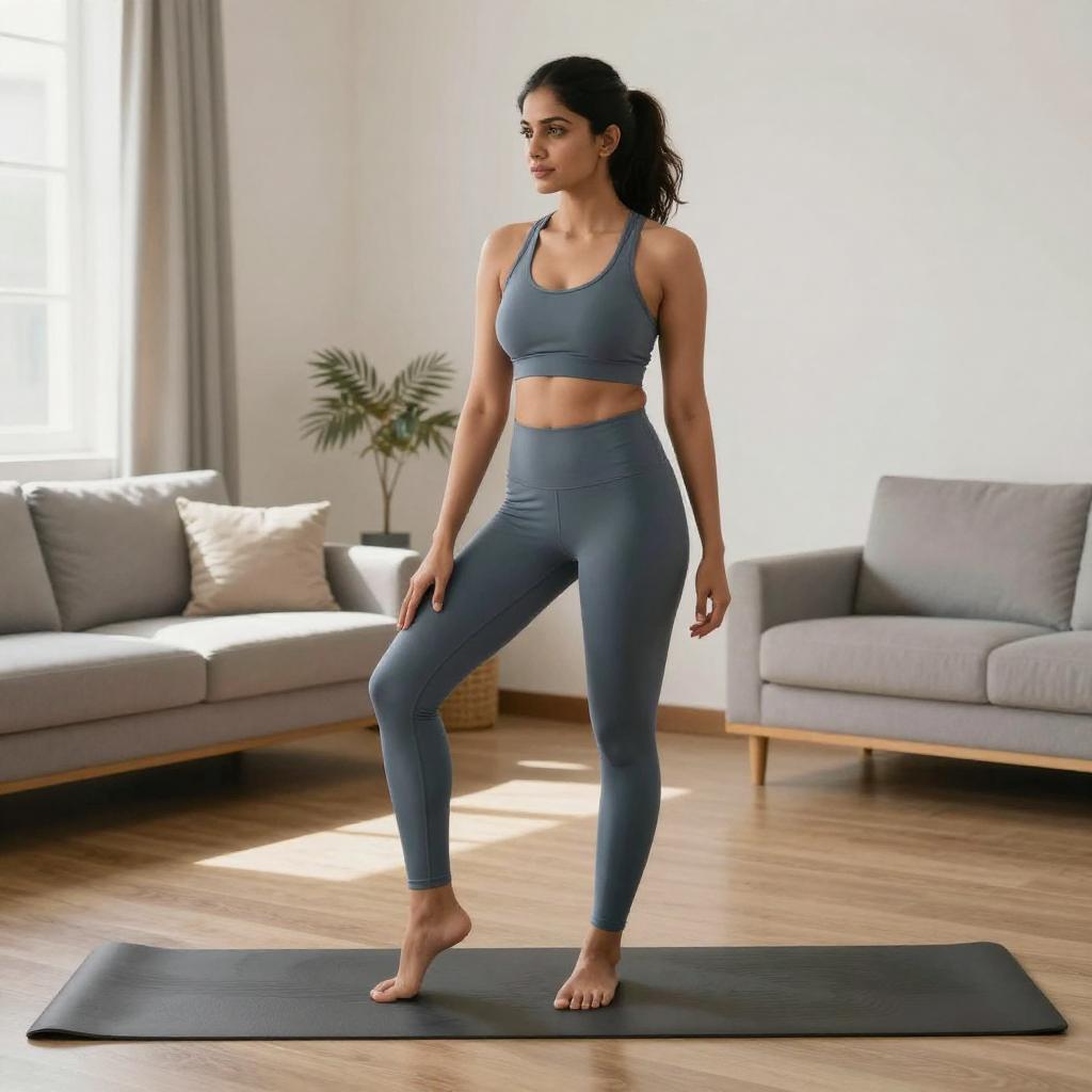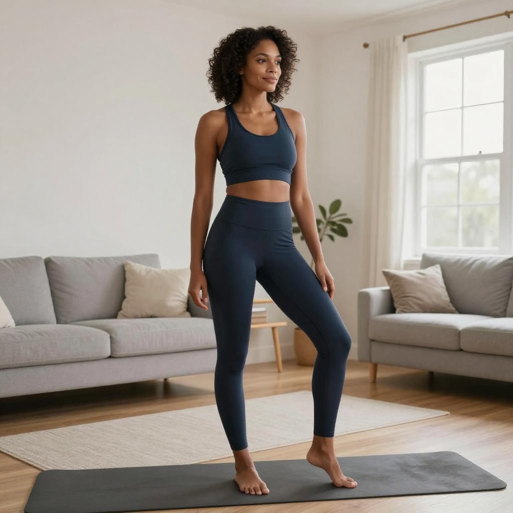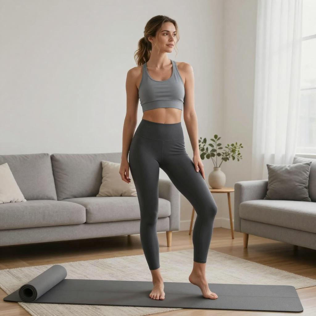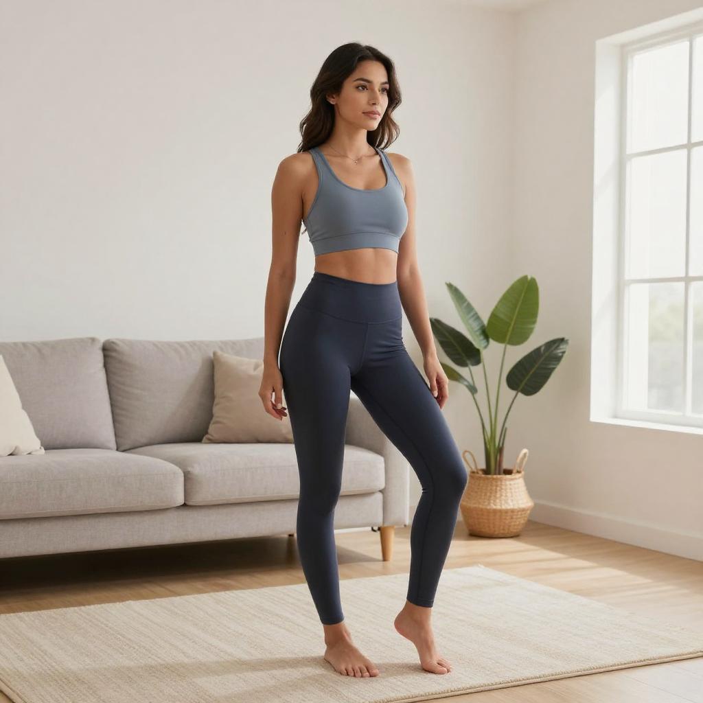 Wide shot of a whole-body figure of a 39-year-old Asian man, slightly overweight, getting dressed in sports clothes at home, realistic commercial photo
