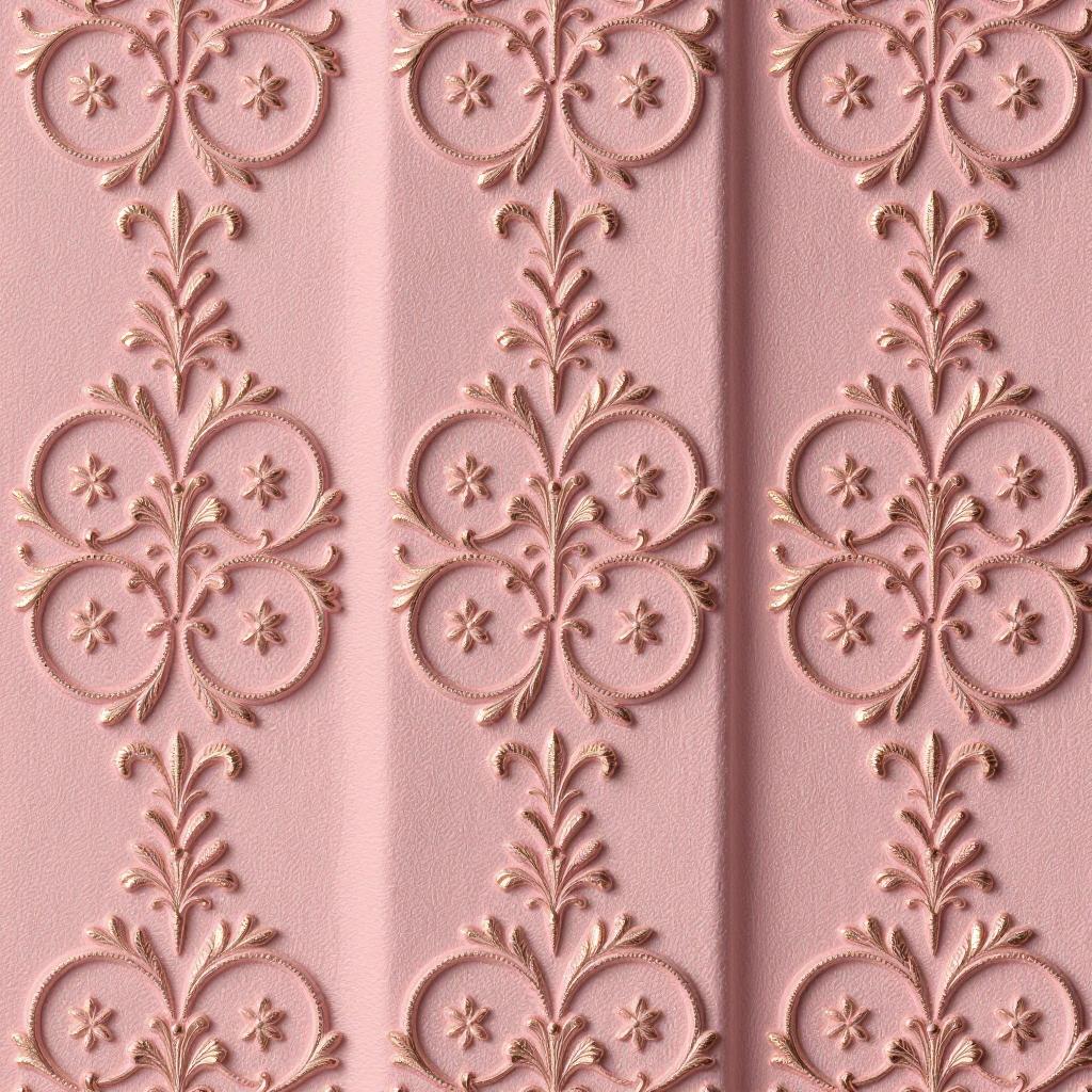 Scrollworks pattern featuring light Rococo scrolls with delicate flowers and shells in rose-gold scrollwork on soft blush pink arranged as vertical panel of scrolls suitable for a book spine or column on brocade-like textile with slight sheen rendered as relief carving effect with strong highlights and cast shadows, ultra-detailed, sharp ornamental design, high resolution, intricate decorative pattern art