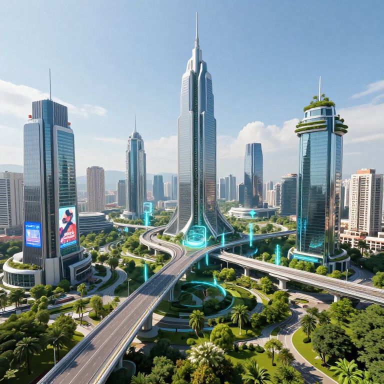 CGI image of a futuristic cityscape with towering skyscrapers, glowing neon lights, green highways, and lush greenery under a clear blue sky
