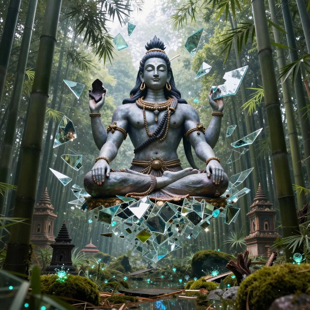 Shiva – The destroyer and god of transformation, shown as a meditative figure seated in the Himalayas, standing in a shattered-mirror cosmos of floating glass fragments reflecting alternate eras, hovering above a petrified bamboo forest carpeted with bioluminescent moss and distant monolithic temples
