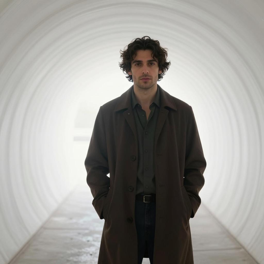 Portrait of a man with disheveled dark hair and a thin beard, wearing a black turtleneck sweater. He is seen peering around a slightly ajar wooden door with an intense and focused expression. The background features a bright blue wall with a black hat hanging on the right side.