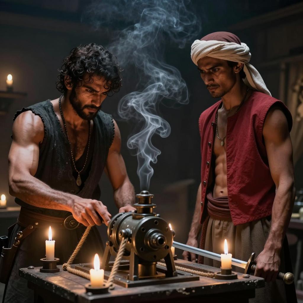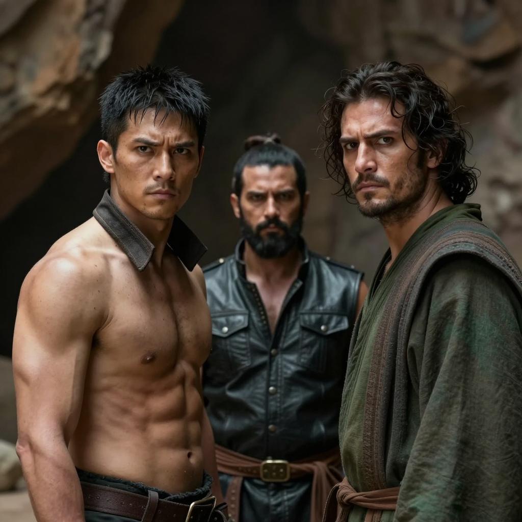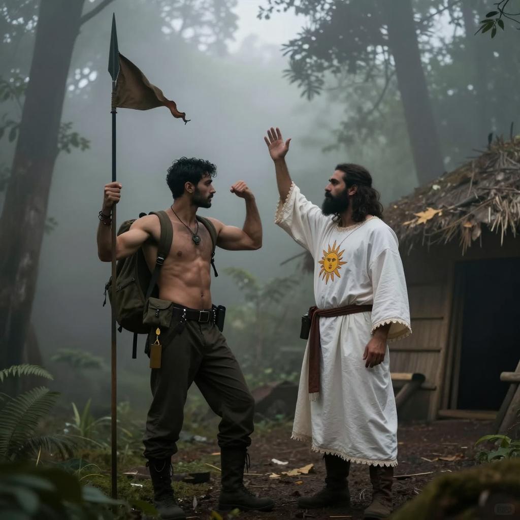 Two men in a foggy forest. Left man, muscular, shirtless, carrying a backpack and spear, flexing arm. Right man, bearded, wearing a white robe with a sun emblem, raising hand. Both silhouetted, flag above left, hut structure right.