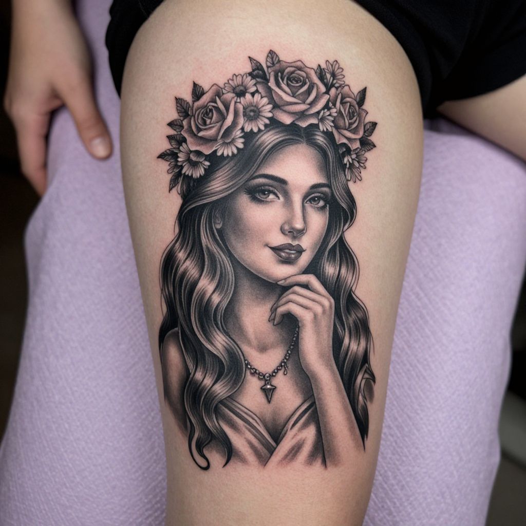 Photograph of a detailed black and grey tattoo on a person's upper thigh. The tattoo depicts a serene woman with long, wavy hair wearing a floral crown of roses and daisies. She has a subtle smile, one hand touching her chin, adorned with a necklace. The background shows a person's hand holding a textured, light purple fabric. The tattoo style is realistic and intricate.