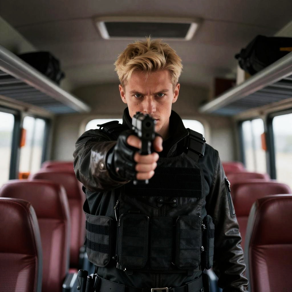 Man with short blond hair, intense gaze, pointing a handgun forward. Wearing dark leather gloves, jacket, and tactical vest. Inside a dimly lit bus, with overhead storage racks and red seats. Central position, focused expression. Photographic style.