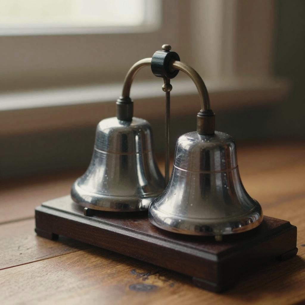 Close-up of a classic mechanical wecker with twin bells, chrome finish reflecting soft ambient light, placed on a worn wooden surface, nostalgic atmosphere, shallow depth of field, warm sunlight streaming through window