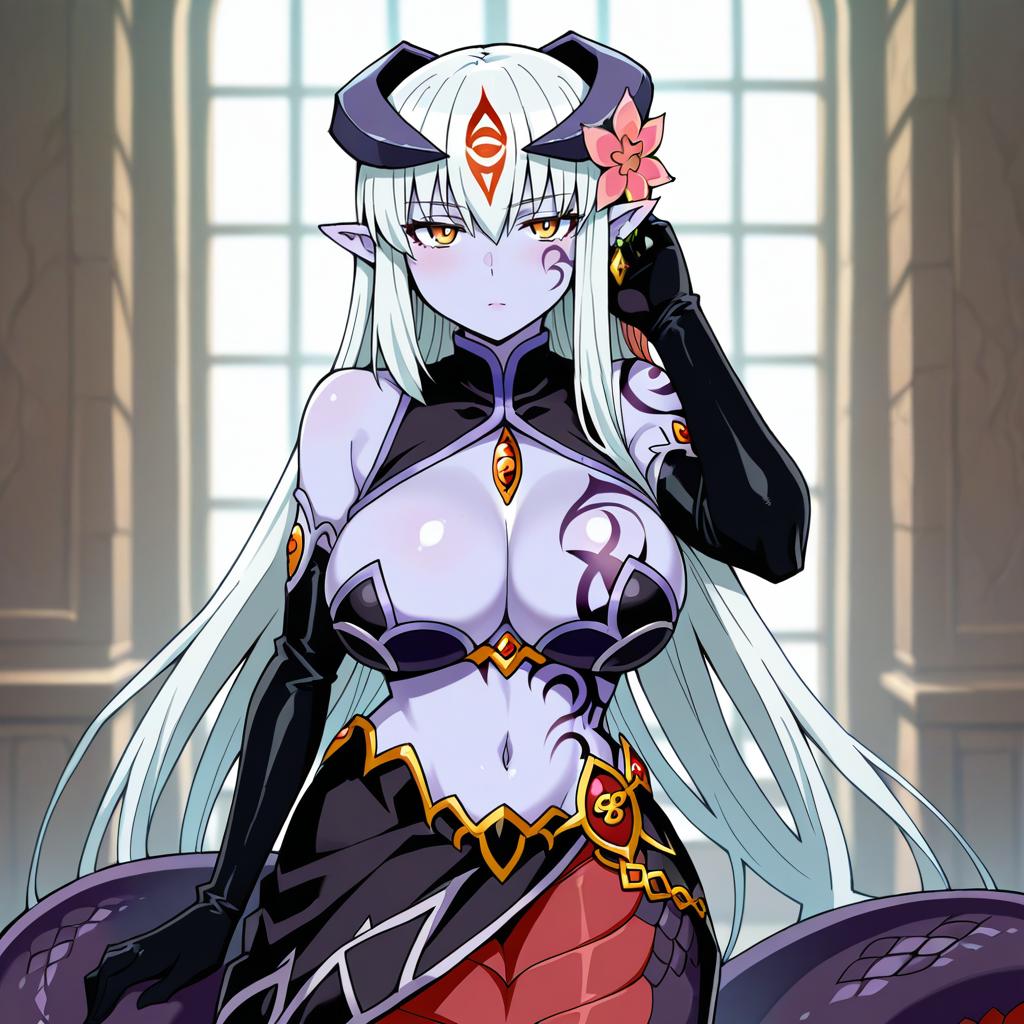 Alipheese fateburn xvi, mon-musu quest!, 1girl, purple skin, pointy ears, horns, yellow eyes, hair between eyes, eye tattoo, white hair, very long hair, long hair, hair tattoo, hair flower, large breasts, breast tattoo, navel, stomach tattoo, facial tattoo, elbow gloves, black gloves, black skirt, lamia, scales, single earring, by artist kyousaru, illustrious