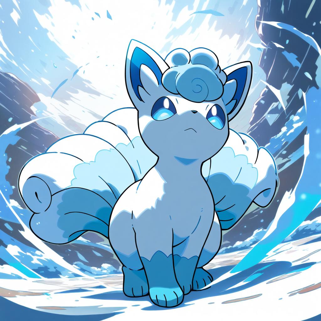 Alolan vulpix, pokemon, no humans, fox ears, fox tail, blue eyes, short hair, white hair, pokemon (creature), white fur, two-tone fur, body fur, by artist fuwa daisuke, animagine