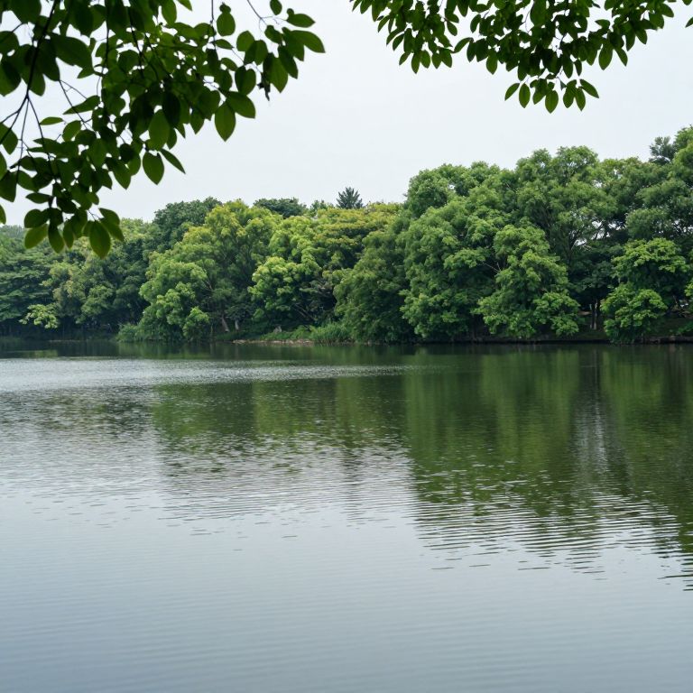 Photograph of a serene lake bordered by dense, lush green trees. The water is calm with gentle ripples, reflecting the surrounding foliage. Overhanging branches with green leaves frame the top of the image, creating a natural border. The sky above is overcast, casting a soft light over the scene. The tree line is varied in shades of green, indicating a mix of tree species. The overall composition is tranquil and peaceful, emphasizing the natural beauty of the landscape. The photograph captures the essence of a quiet, untouched woodland area by the water.