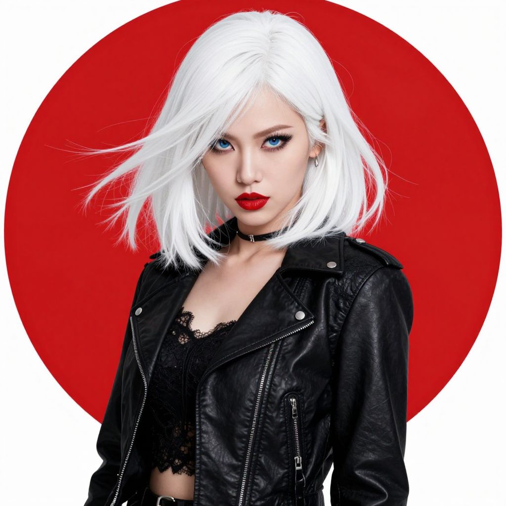 Photograph of a young woman with striking white hair, blue eyes, and bold red lipstick, set against a bright red circular background. She wears a black leather jacket over a lace-trimmed black top, and a black choker necklace. Her hair is wind-swept, adding a dynamic feel. The stark contrast between her pale skin, white hair, and the vivid red background creates a dramatic, edgy look. The image has a high-contrast, fashion-forward style, emphasizing her intense gaze and rebellious aesthetic.