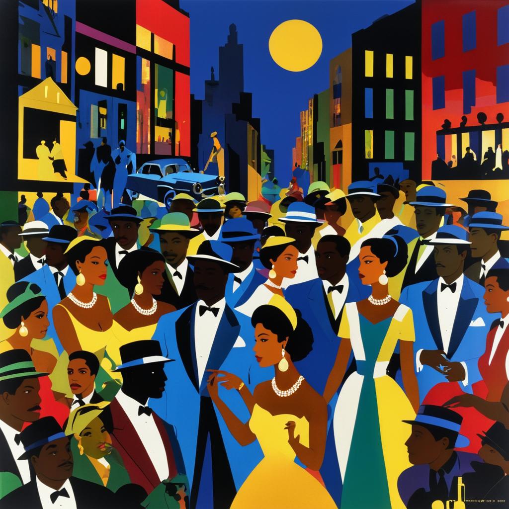 Harlem night vividly painted by Romare Bearden, elegant figures come to life with collage techniques, golden age cinema vibes, dramatic lighting, preserved as if on 35mm film, breathtaking composition