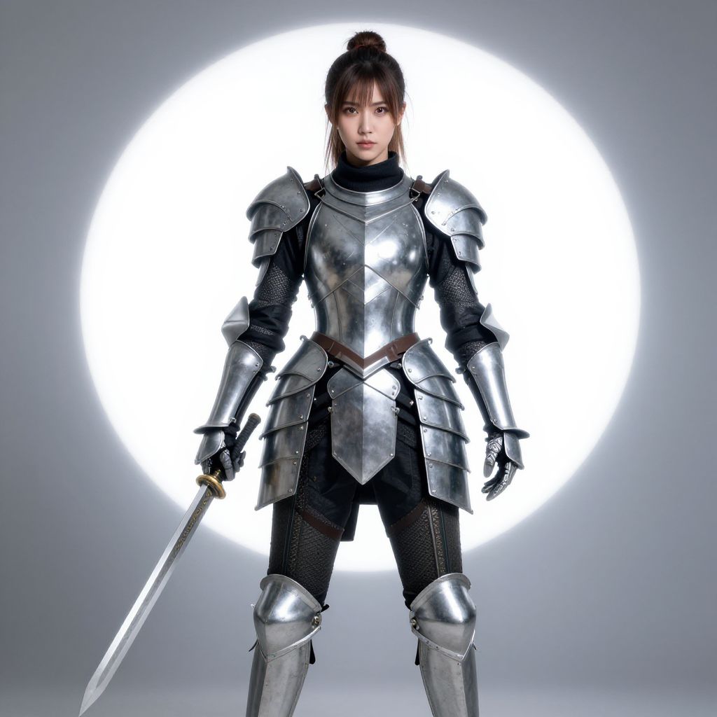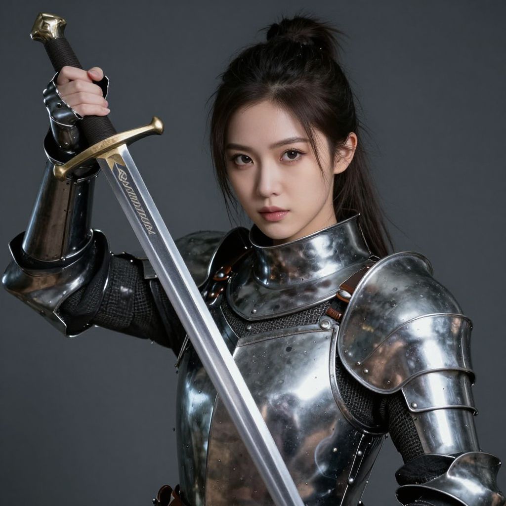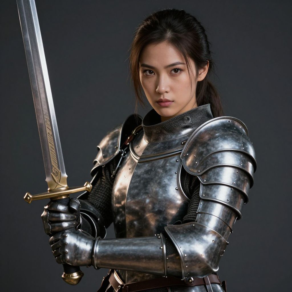 Photorealistic CGI of a young Asian woman with long brown hair, wearing shiny silver armor and holding a gold-hilted sword, looking determined.
