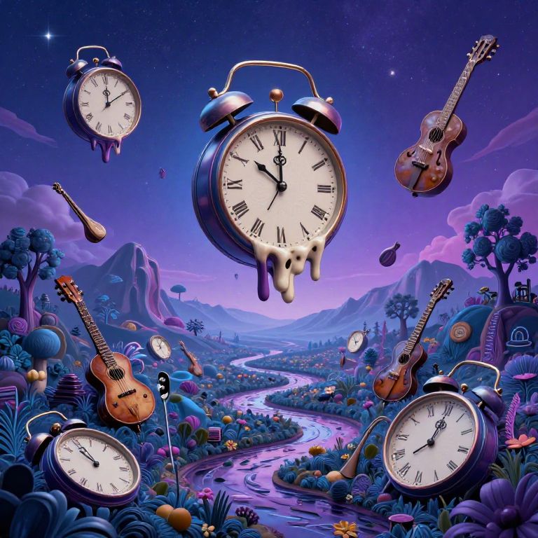 This digital illustration depicts a surreal, vibrant landscape under a starry purple and blue night sky. Floating clocks with dripping, melted appearances surround the scene, alongside five guitars in various orientations. The background features a winding river, lush, colorful vegetation, and distant, glowing mountains. The image combines whimsical elements with a dreamlike atmosphere, using bright, contrasting colors and detailed textures to create a fantastical, surreal effect. The style is reminiscent of fantasy illustration, with a playful, otherworldly tone.