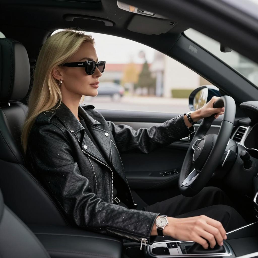 Blonde woman with long hair and black sunglasses driving a black luxury car. Wearing black leather jacket with ured pattern, black pants, silver watch, and black wristband. Right hand on steering wheel, left hand on gearshift. Modern car interior, dark leather seats, visible dashboard. Background includes blurred urban scenery through car windows. She has a calm expression. One person. Photorealistic image.