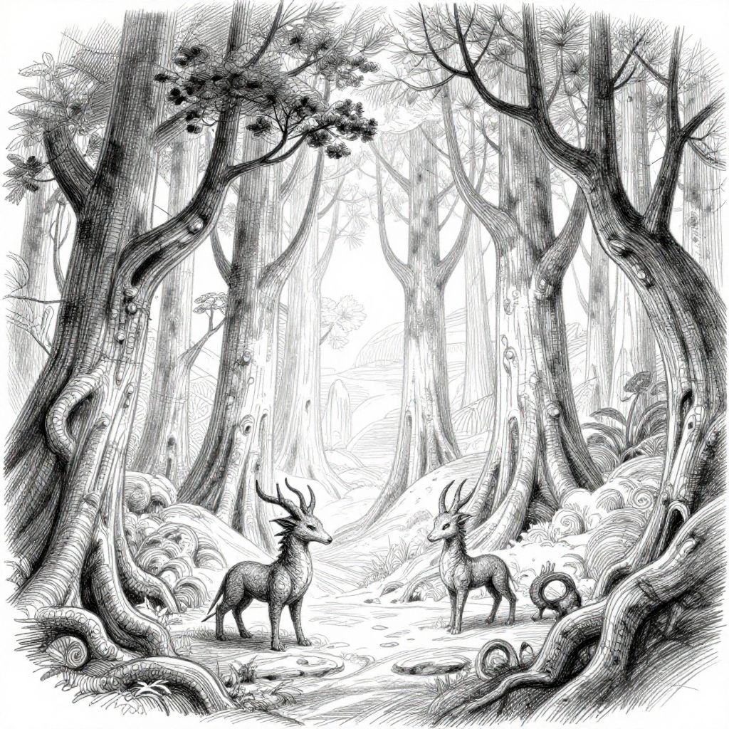 Controlnet sketch of an ancient mythical forest, intertwining trees and fantasy creatures, fine sketch lines with cross-hatching texture, combining natural organic shapes with elegant contrast to evoke a mystical atmosphere.