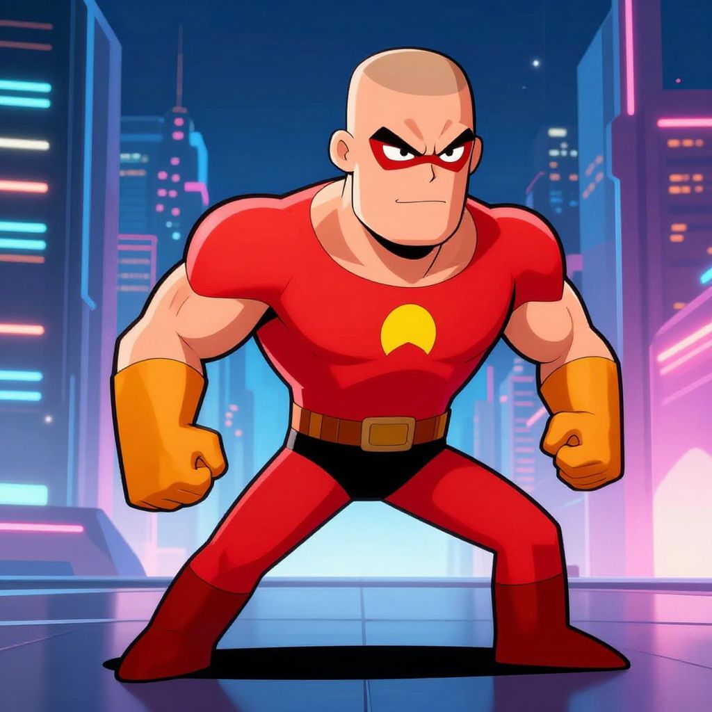 Digital drawing of a muscular, bald man in a vibrant red superhero costume with a yellow emblem on the chest. He has orange gloves and boots, and a determined expression with black, angry eyes. He stands in a powerful, wide-legged stance in a futuristic cityscape with neon lights and tall buildings. The background features a mix of blue, pink, and purple lights, creating a cyberpunk atmosphere. The character's large muscles and exaggerated features give him a cartoonish, dynamic appearance.