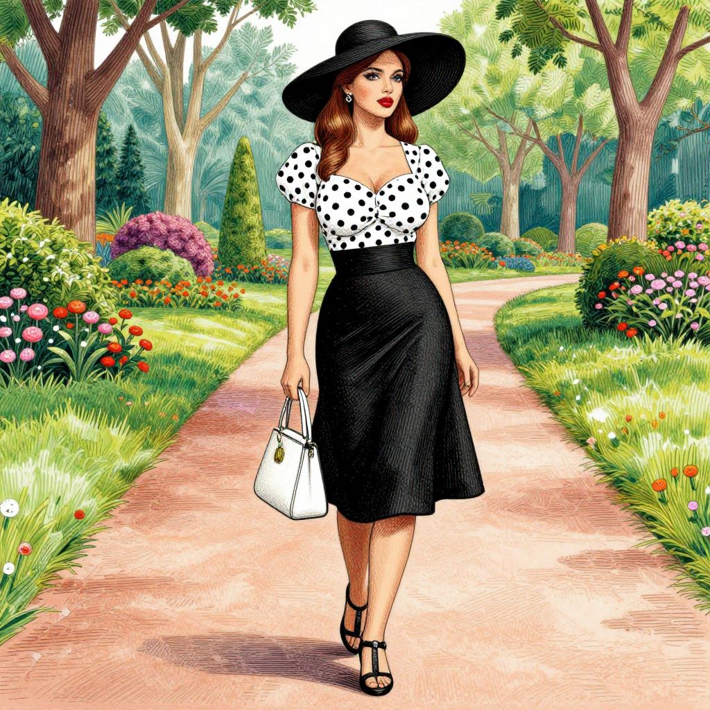 Digital illustration of a woman walking down a park path. She has fair skin, red lipstick, and wavy brown hair. She wears a wide-brimmed black hat, white blouse with black polka dots, and a black knee-length skirt. She carries a white handbag in her right hand and wears black sandals. The background features lush green trees, colorful flowers, and a well-maintained garden. The path is pinkish with grass on either side. The style is vibrant and slightly cartoonish, with bold colors and clear outlines.