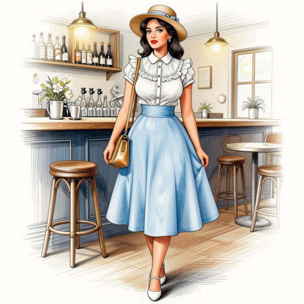 A woman, vintage-inspired, white polka dot blouse, high-waisted A-line black skirt, large floppy black hat, classic T-strap heels, small white handbag, Wonderland path with changing colors. visual style: hatching art style, intricate lines, cross-hatching shadows, detailed textures Sexy. Pretty face and beаutiful eyes. Big breasts