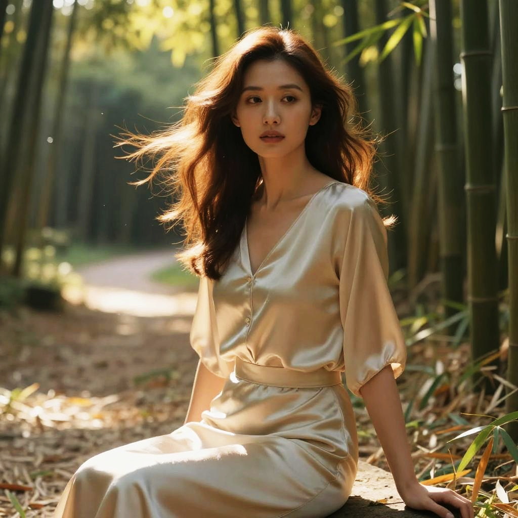 Photograph of a brunette woman with wavy hair sitting on a forest path, bathed in sunlight. She wears a silky, beige, V-neck dress with a cinched waist, her light skin glowing in the dappled light. Tall bamboo trees with green leaves flank the path, creating a natural, serene background. Sunlight filters through the leaves, casting a warm, golden glow on the woman and the forest floor. Her expression is calm and contemplative. The image has a soft, ethereal quality, with the sunlight highlighting her features and the texture of the silk fabric.