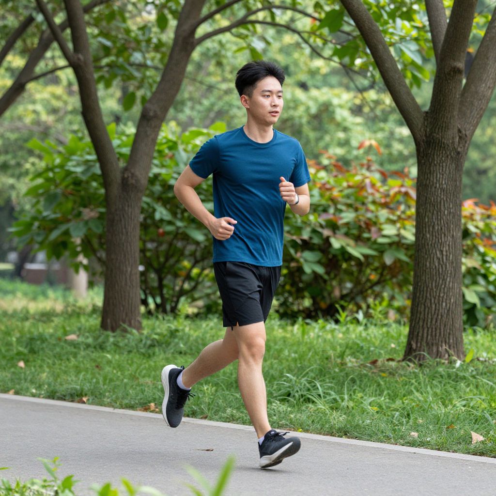 Photograph of an Asian man jogging in a park, wearing a blue t-shirt, black shorts, and black sneakers, with green trees and grass in