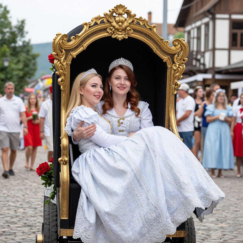 Photograph of two smiling women in white, ornate wedding dresses with silver tiaras, seated on an elaborate, gold-framed, black throne. The woman on the left has blonde hair, while the woman on the right has curly brown hair. They are in a cobblestone street with a crowd of casually dressed people in the background. The setting includes traditional European-style buildings. The throne has red flowers at its base, and the women's dresses have intricate lace patterns. The image has vibrant colors and a festive, celebratory atmosphere.