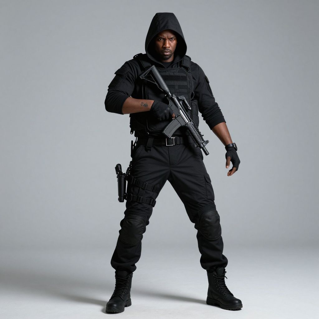 A highly detailed, black man assassin with a haunting aura, wearing all-black tactical gear and hidden weapons, stands with a fluid, ethereal movement, emanating a sense of danger and mystery, with a small tattoo on his left wrist symbolizing death.