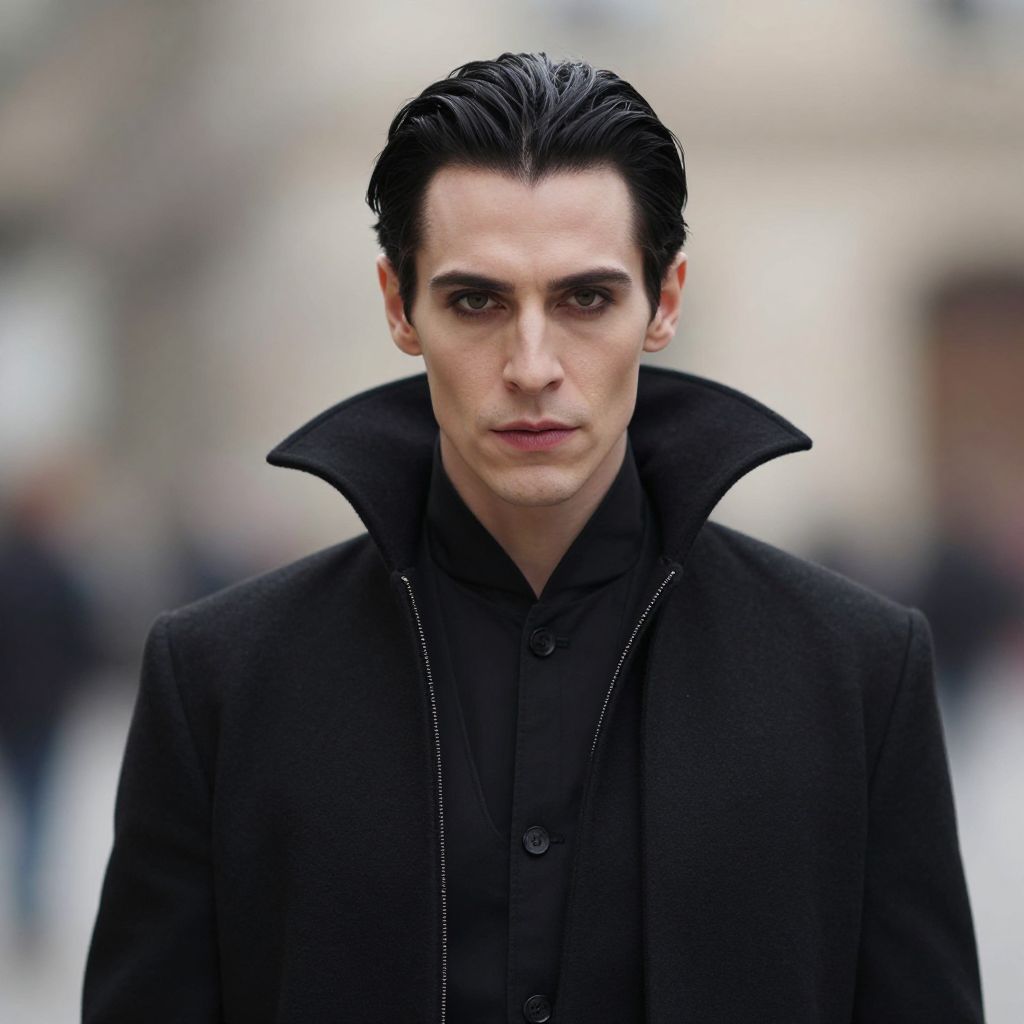 Photograph of a pale-skinned man with dark, slicked-back hair, wearing a black, high-collared coat over a black shirt. His intense brown eyes are focused directly at the camera, and his expression is serious and slightly stern. The background is blurred, featuring indistinct figures and a light-colored, urban setting. The overall tone is moody and dramatic, with the man's dark attire contrasting against the lighter background. The image has a cinematic quality, reminiscent of a character from a Gothic or dark fantasy film.