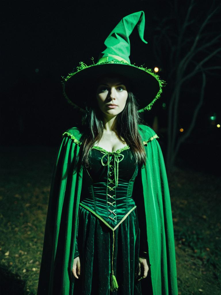 Woman in Green Witch Costume, photorealistic outdoor portrait at night