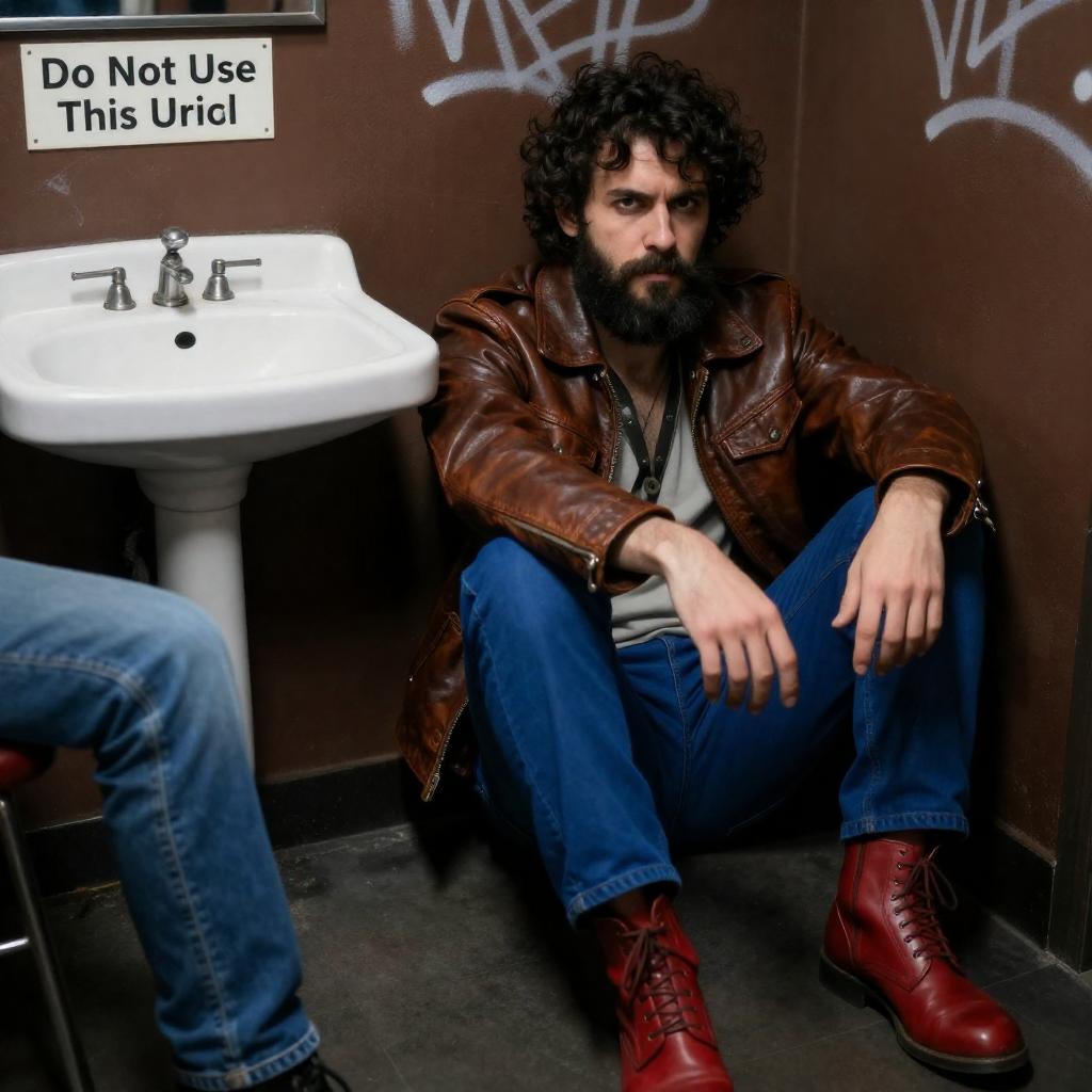 Man with dark hair and beard, intense expression, white ribbed sweater, crawling out of a dark, tentacle-like container. Tentacles wrap around him. Man's right arm extended forward, left arm behind. Dark, ured tentacles in background. Photograph.