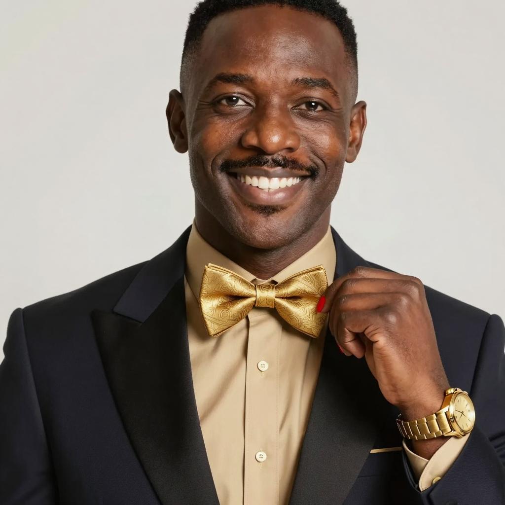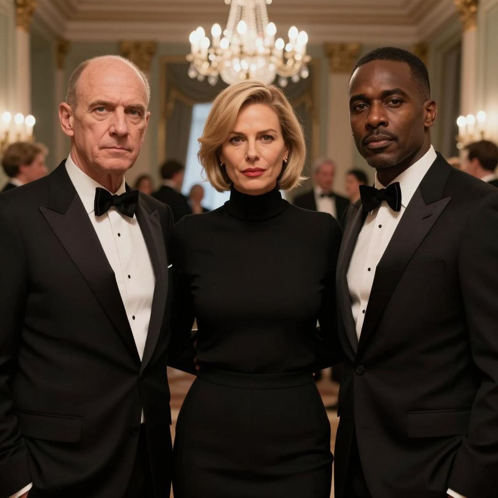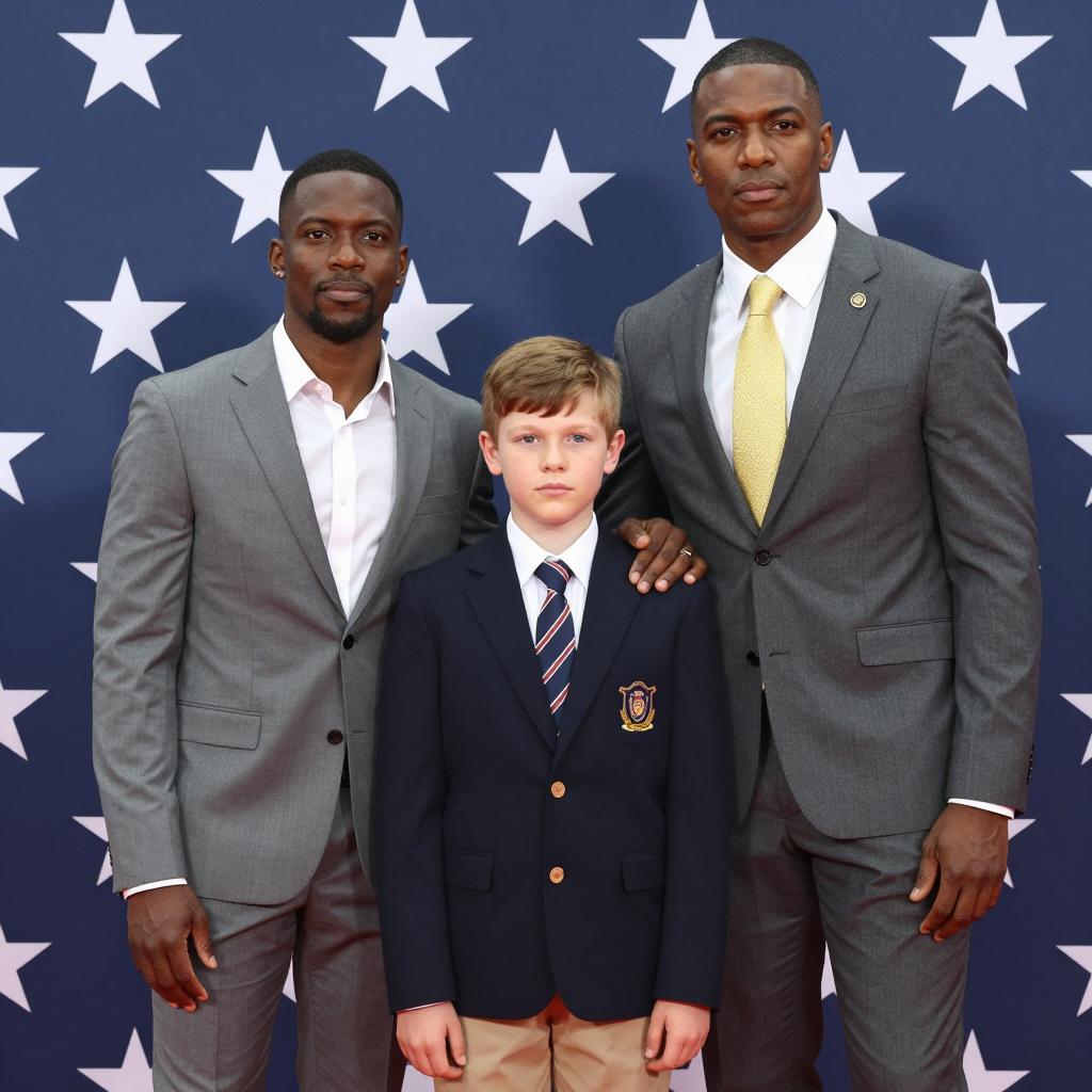 Two men and a boy against a blue background with white stars. The tall man on the right has dark skin, wears a gray suit, yellow tie, and a pin on his lapel. The boy in the center has light skin, wears a dark blue blazer with a school crest, striped tie, and khaki pants. The shorter man with dark skin on the left has his arm around the boy's shoulder, wearing a gray suit and white shirt. The boy has a serious expression, the men have neutral expressions.