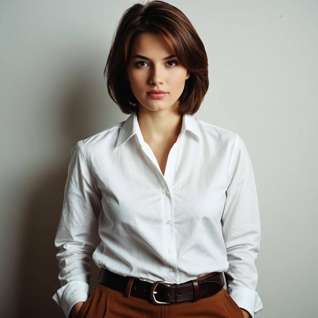 Corporate clothes ladies,1girl, solo, realistic, short hair, belt, brown hair, blonde hair, simple background, grey background, dress, own hands together, brown eyes, lips