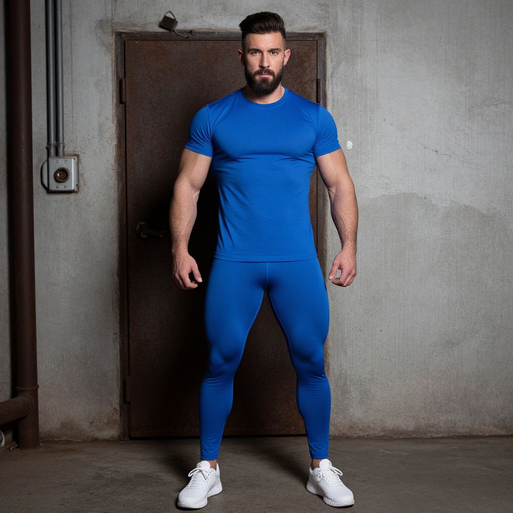 Photograph of a muscular, bearded man standing confidently in a dimly lit, industrial-style room. He's wearing a tight, bright blue, short-sleeve t-shirt and matching blue leggings, with white sneakers. His short, dark hair is neatly styled, and he has a serious expression. The background includes a grungy, gray and white wall with a rusty door and some pipes. The lighting highlights his defined muscles and physique.