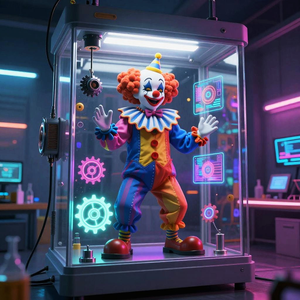 Photograph of a colorful, digital clown in a neon-lit, glass enclosure with glowing gears and symbols in a futuristic lab.