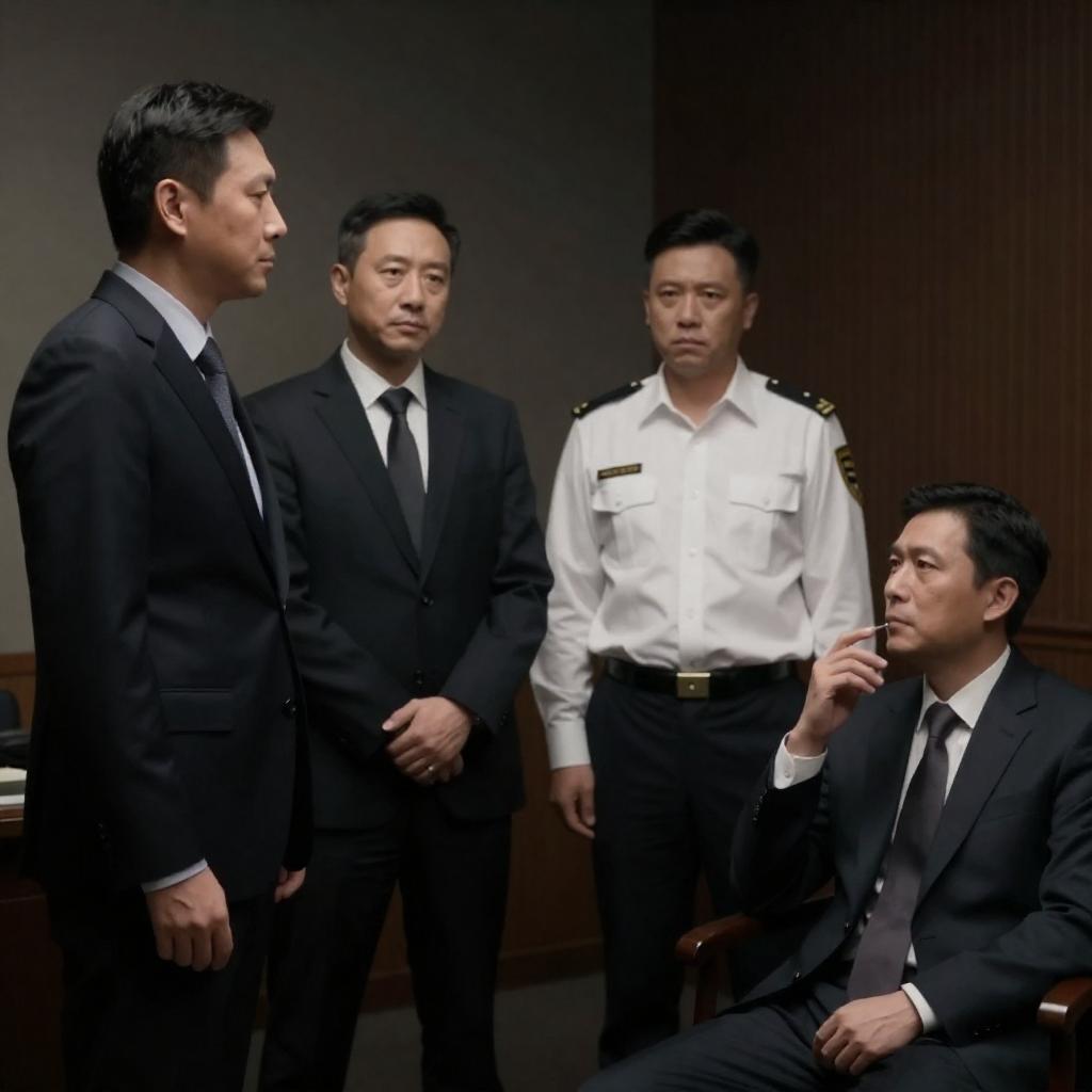 Four Asian men in a dimly lit industrial space. An older man with gray hair is being carried piggyback by a younger man with black hair wearing a black vest over a gray shirt. Two other men, one in black casual wear and the other in a black suit with a ponytail, face the group. The background features metal bars, wooden panels, and industrial equipment with a blurred effect. Expressions show seriousness and intensity.