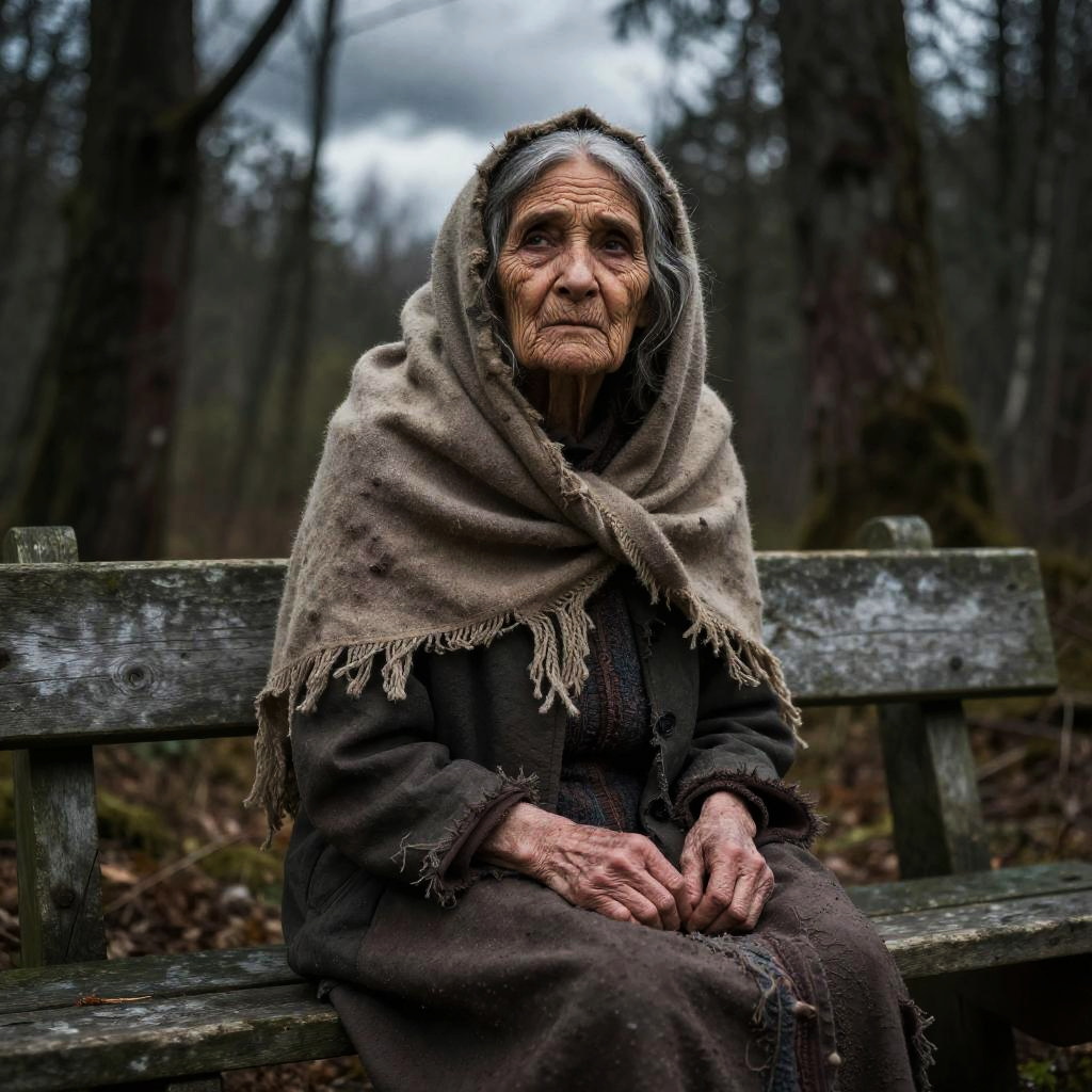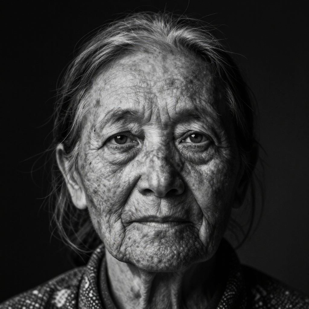 Portrait of an old ugly woman with pronounced facial features, sunken eyes, and blemished skin, wearing a faded shawl, set against a dark, abstract background, focus on texture, detail, and raw human emotion, high contrast lighting.
