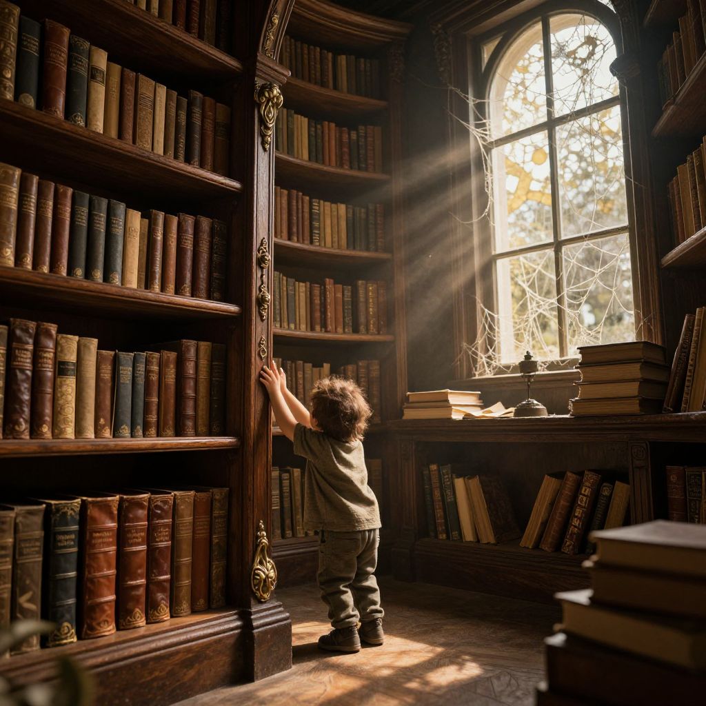 In the captivating style of an undiscovered literary haven, create an image depicting a mysterious old library brimming with arcane tomes. From a child's viewpoint, peer through the legs of a towering, weathered wooden bookshelf that curves like a labyrinth. Soft beams of golden sunlight filter in through dusty, cobweb-laden windows, casting playful patterns that dance on ancient leather-bound volumes and intricate brass fittings. The air is heavy with the scent of aged parchment and the promise of untold stories waiting to be discovered by curious young minds venturing into this captivating hidden world.