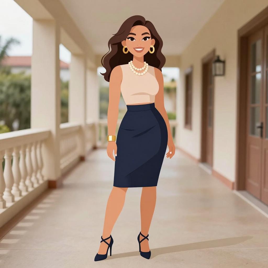 Digital illustration of a smiling woman with wavy dark hair, wearing a light blue ruffled jumpsuit, holding a white handbag, standing on a