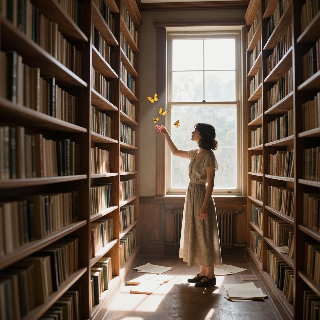 Sunlit library aisle flanked by towering wooden shelves brimming with ancient books, where a woman stands near a large window, her outstretched arm guiding three golden butterflies as sunlight streams through, casting warm beams across scattered papers and creating a serene, timeless atmosphere.