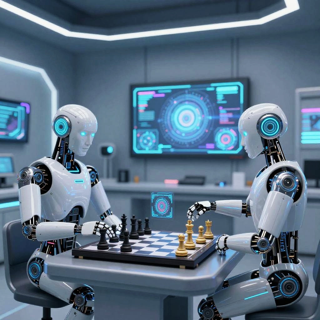 Inteligentes futuristic humanoid robots engaged in a strategic game of chess inside a sleek, high-tech laboratory filled with holographic displays and glowing neon lights, showcasing advanced AI intelligence and sleek metallic designs, digital art.
