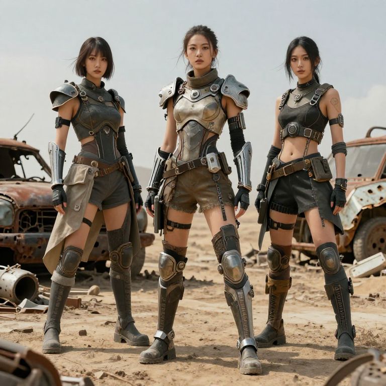 Female dystopian outfits composed of scavenged materials and tech-enhanced armor, showcasing a warrior style with asymmetrical cuts, reinforced boots, and integrated gadgets, standing in a barren wasteland with remnants of destroyed technology and rusty vehicles.