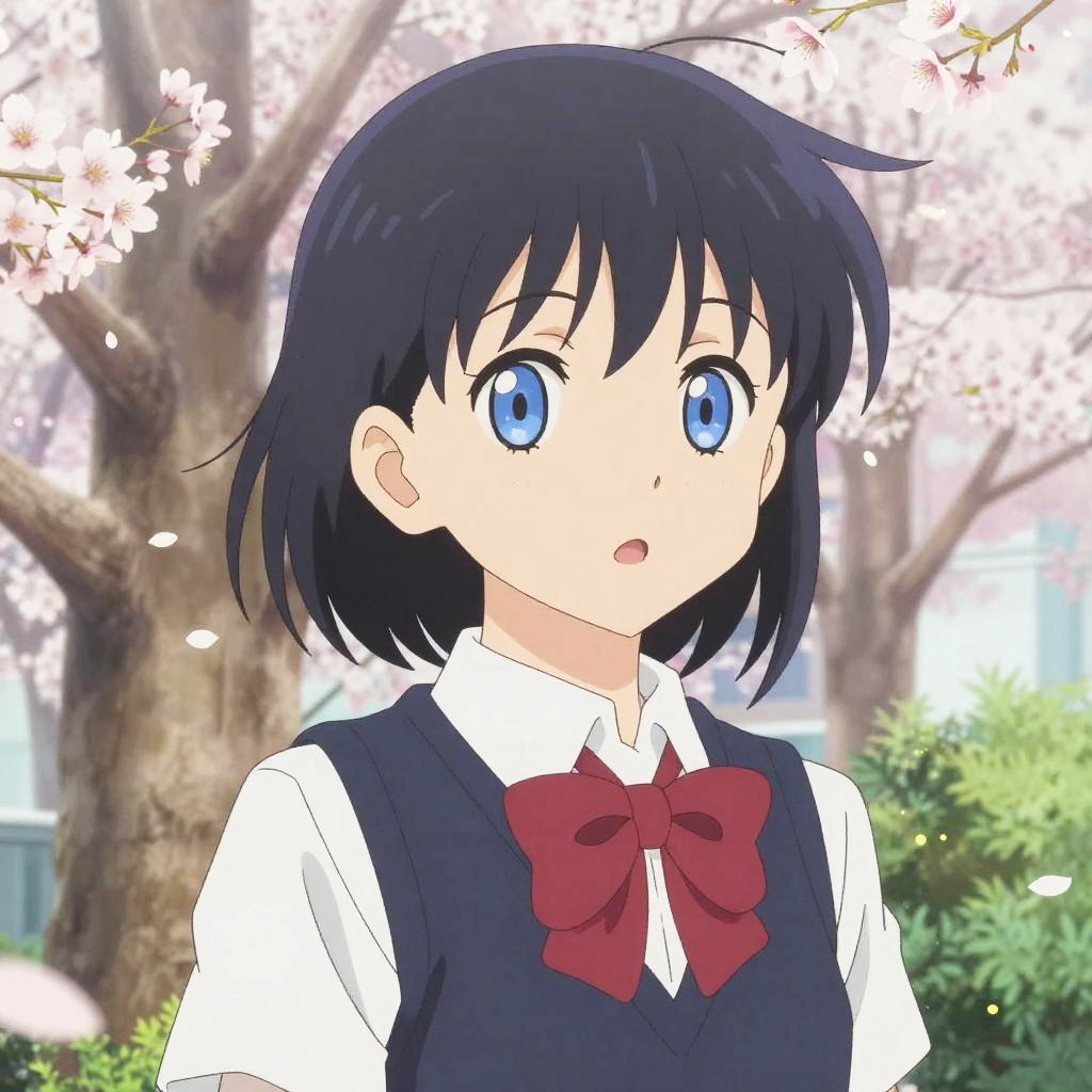 Japanese with blue eyes, anime style, cherry blossom petals falling around, school uniform, bright and expressive eyes, colorful and detailed background