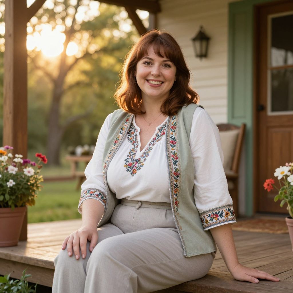 A cheerful woman in her 30s with a warm smile, brown eyes, and medium-length chestnut hair in a neutral outfit and an embroidered costume — light gray slacks, a white blouse, and a soft green vest — seated on a wooden porch in a cozy countryside cottage, with blooming flowers and a golden hour glow spilling through the trees.. The woman has big breasts and cute face