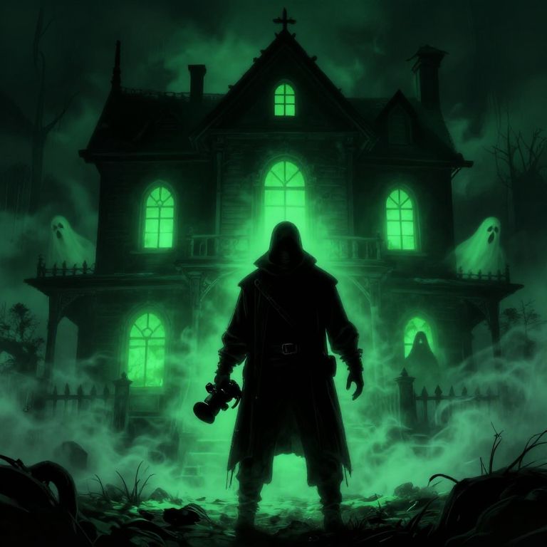 Camera a gravedigger stands in front of a dark haunted house, it’s windows are glowing green, ghosts, green mist, horror, Frank frazetta.,