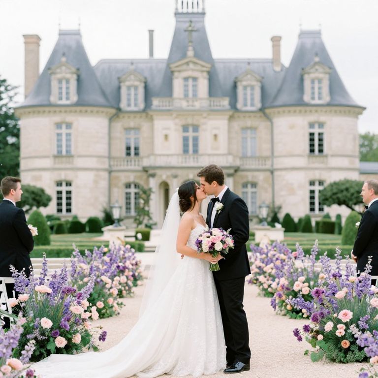A photograph of a bride and groom kissing in a lush, purple and pink flower-lined garden pathway, with an elegant, light beige, French-style chateau in the background. The bride wears a white, strapless, form-fitting gown with a long veil, holding a bouquet of pink and white flowers, while the groom is in a classic black tuxedo. Two other men in black suits stand on either side, partially visible. The sky is overcast, and the garden is meticulously maintained with trimmed greenery. The image has a bright, vibrant, and romantic style.