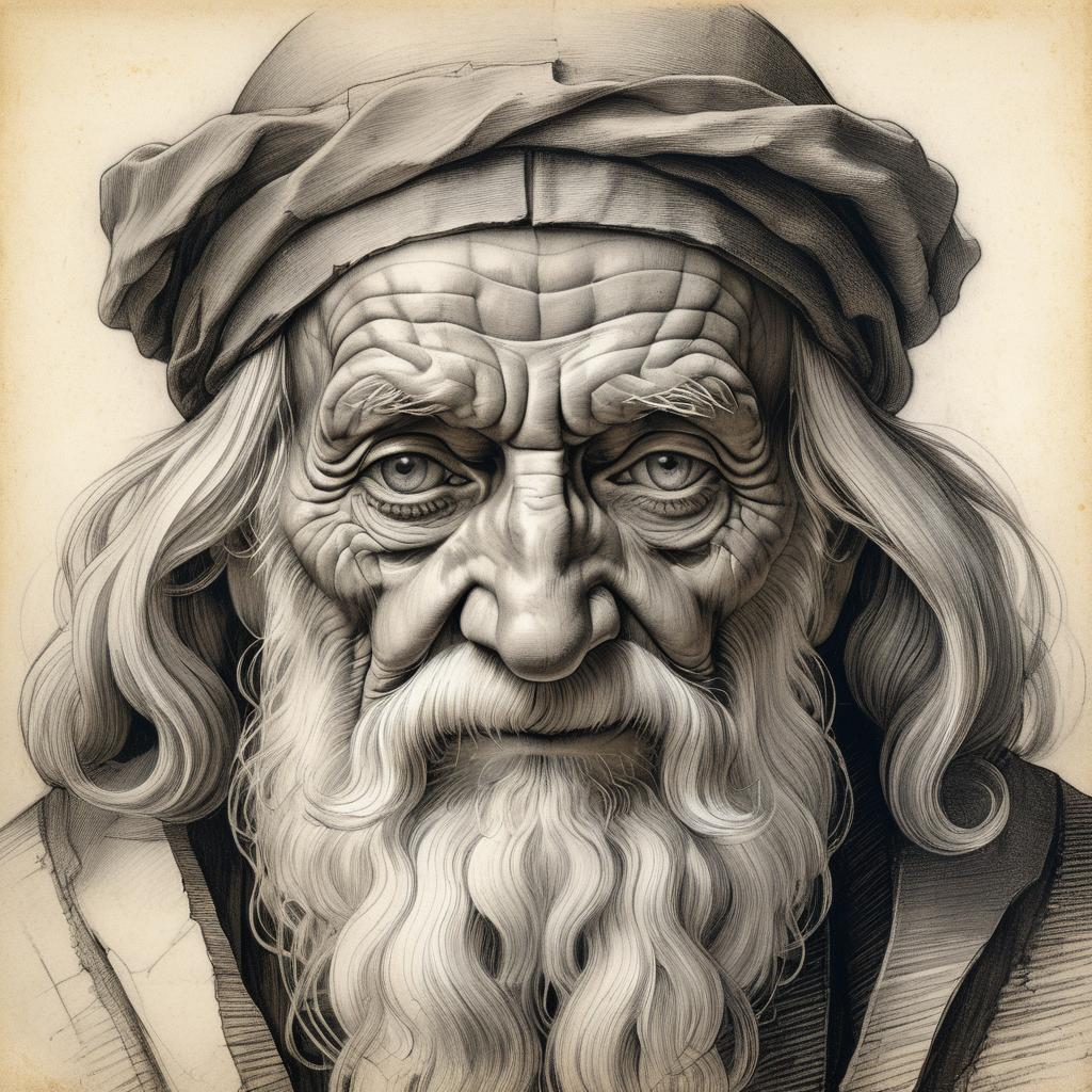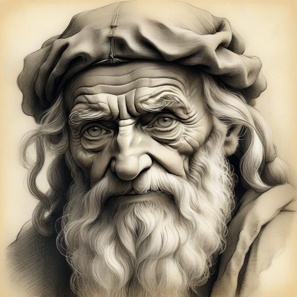 Detailed classical pencil sketch depicting a wise old man with a weathered face, deep-set eyes, long flowing hair, and a full beard. The artwork features gentle shading and intricate lines that evoke a timeless and masterful quality, reminiscent of Leonardo da Vinci's style.