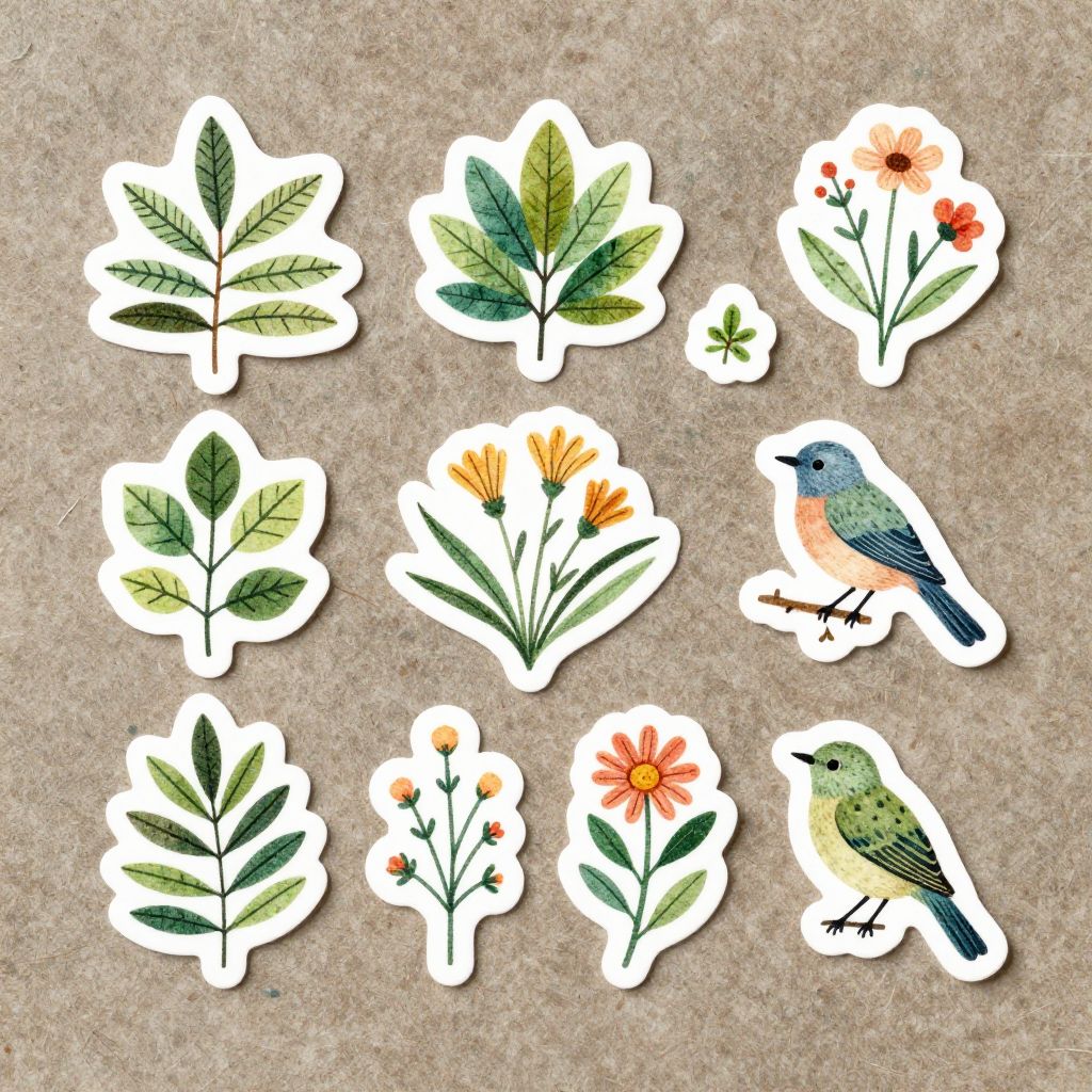 Sticker erstellen inspiration displaying an array of unique, hand-drawn stickers featuring nature elements such as leaves, flowers, and birds, arranged aesthetically on a rustic background with soft lighting and textured paper effects.