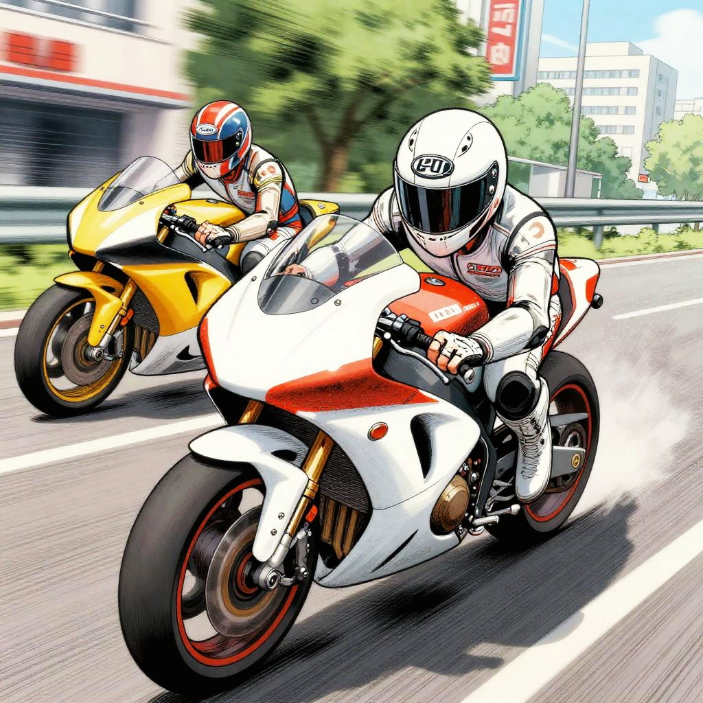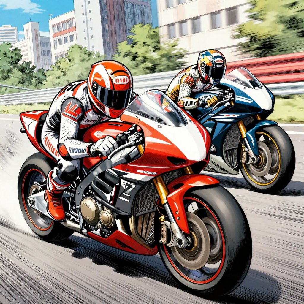 Racing manga style dynamic scene, high speed motorcycles tearing through city streets, vibrant motion blur, intense expressions, detailed manga art with bold lines and dramatic shading