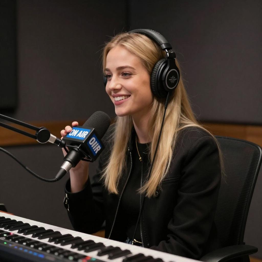 Photograph of a smiling young woman with long blonde hair, wearing a red, ribbed, sleeveless top with cut-out shoulders, sitting at a desk with two golden microphones. Background includes framed black-and-white landscape photos and a decorative circular wall hanging. Bright light illuminates her face.