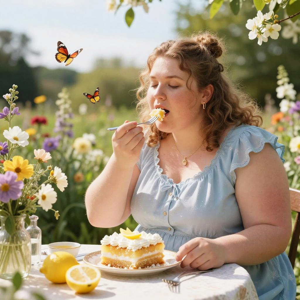 Fat woman eating cake with friends in a modern living room, cozy sofa with colorful cushions, plates of assorted cakes and pastries, laughing and chatting, contemporary and inviting setting