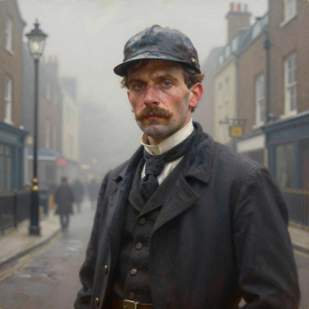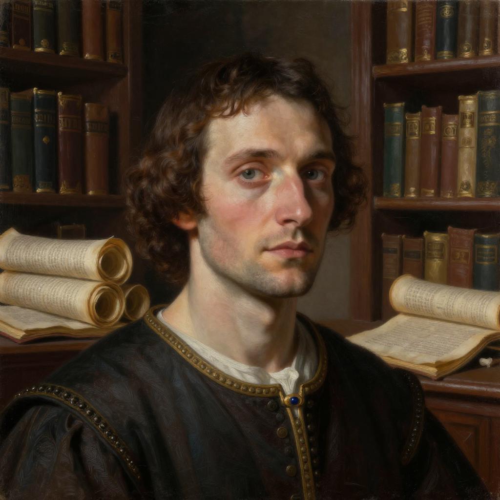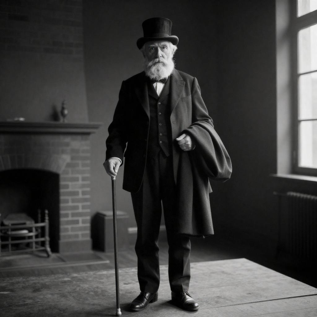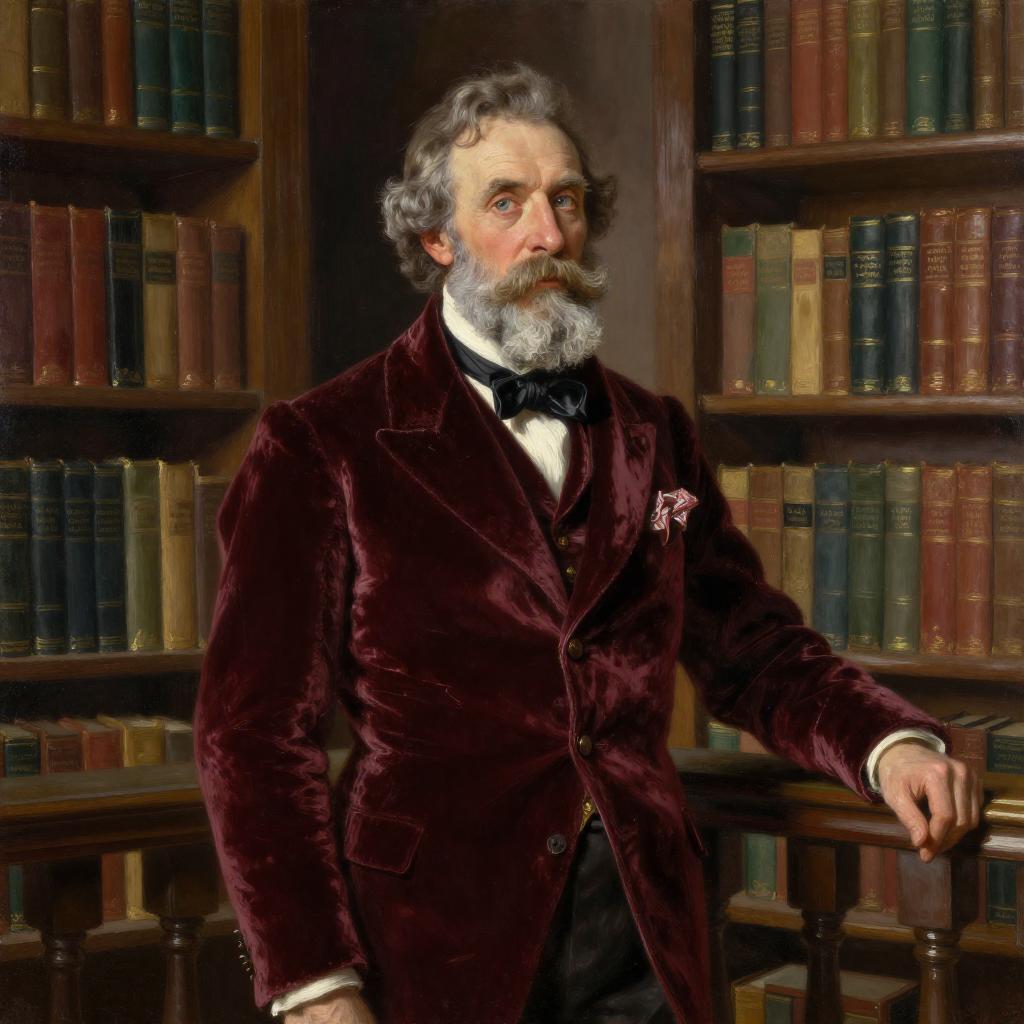 An artistic portrayal of an elderly man with a silver beard and twinkling eyes dressed in a tailored burgundy velvet smoking jacket with silk lapels and a patterned pocket square, standing on a grand library balcony overlooking rows of ancient books, rendered in a Victorian-era oil painting with rich texture and dramatic chiaroscuro lighting.