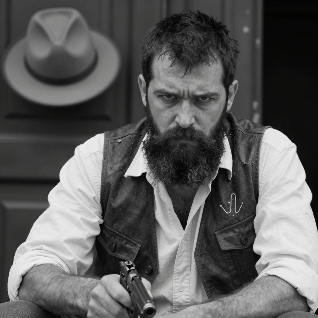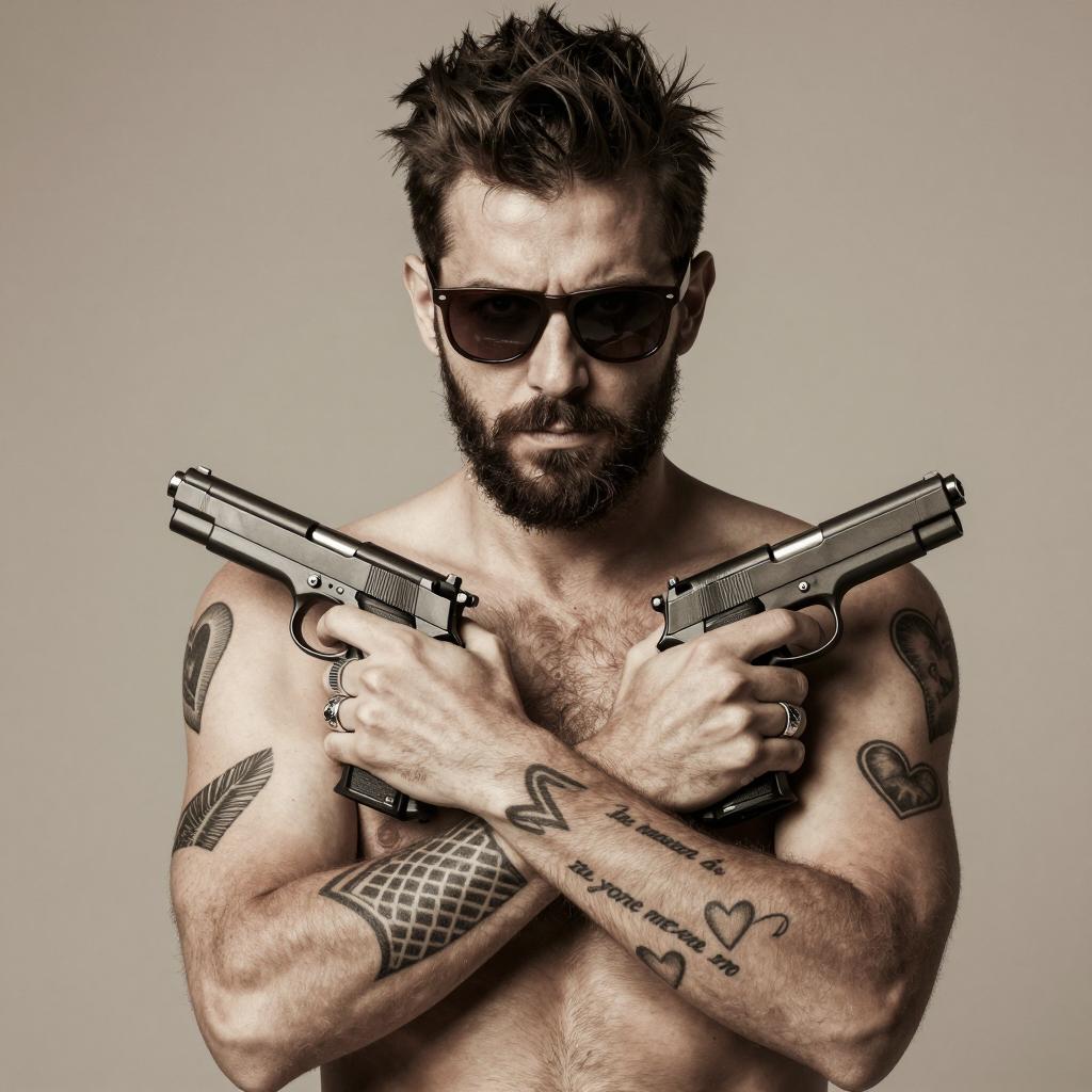 Tattooed man with dark hair and beard, wearing dark sunglasses, shirtless, crossing arms over two handguns. Warm, sepia-toned background. Rings on both hands. Intense expression. Arms covered in heart, script, and geometric tattoos.